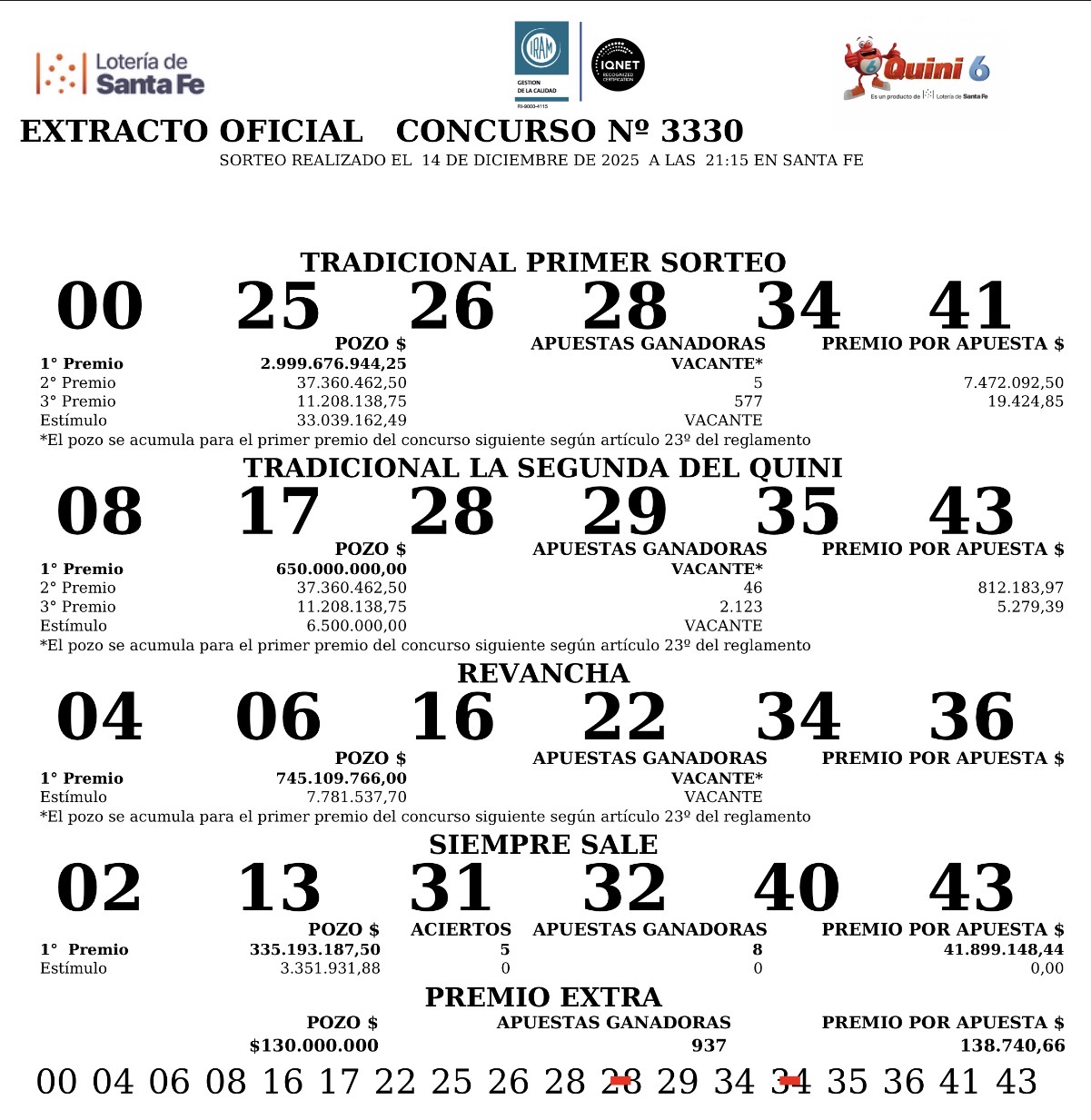 Este miércoles 14 de diciembre se sorteó el concurso N° 3.330 del Quini 6, de la Lotería de Santa Fe.