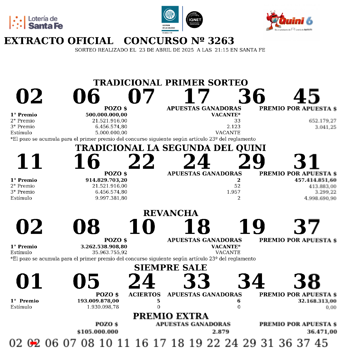 Este miércoles, 23 de abril, en el sorteo Tradicional del Quini 6 salieron el 02-06-07-17-36-45, el pozo de $500.000.000 quedó vacante.