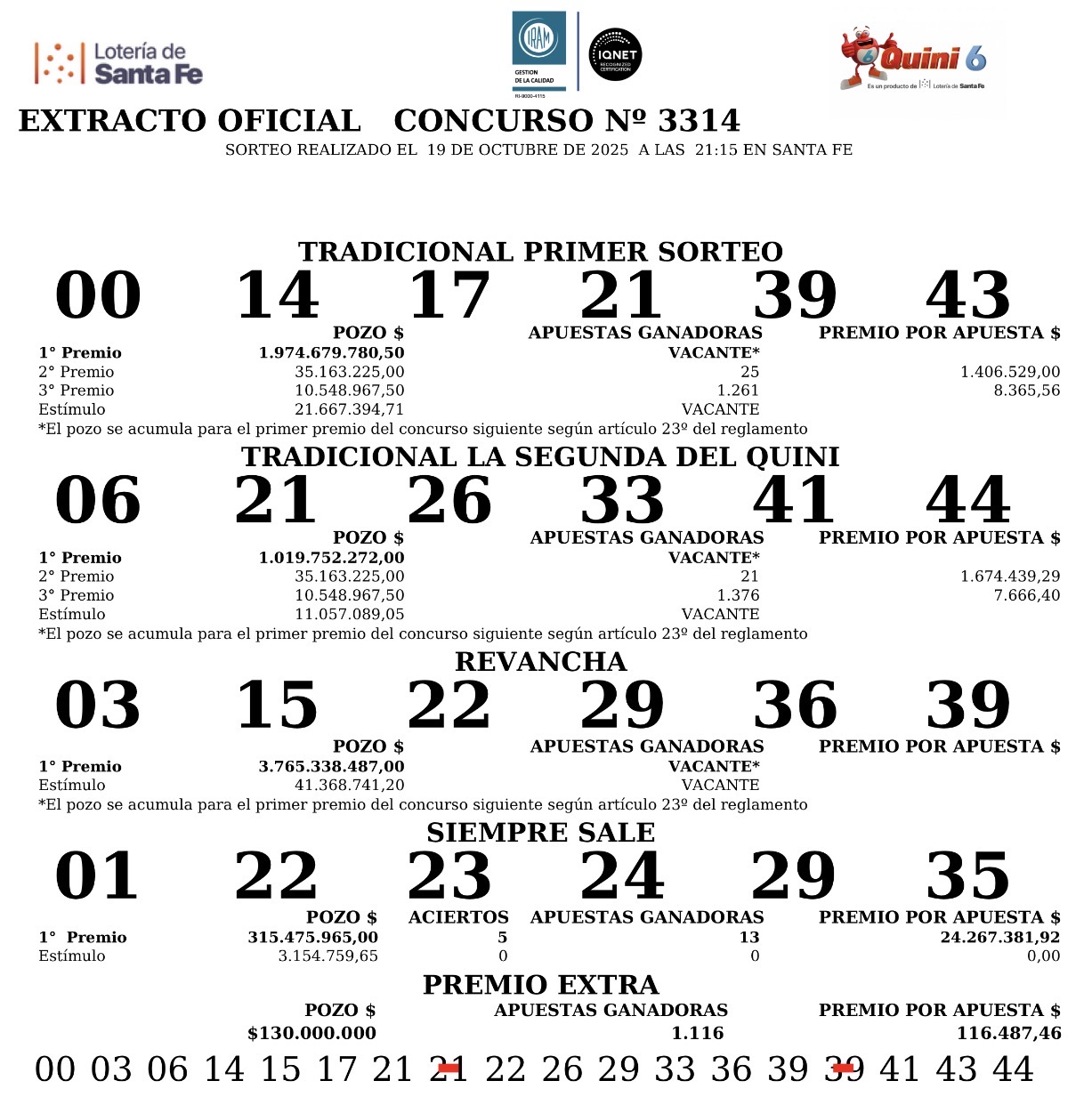 Este domingo 19 de octubre se sorteó el concurso N° 3.314 del Quini 6, de la Lotería de Santa Fe.