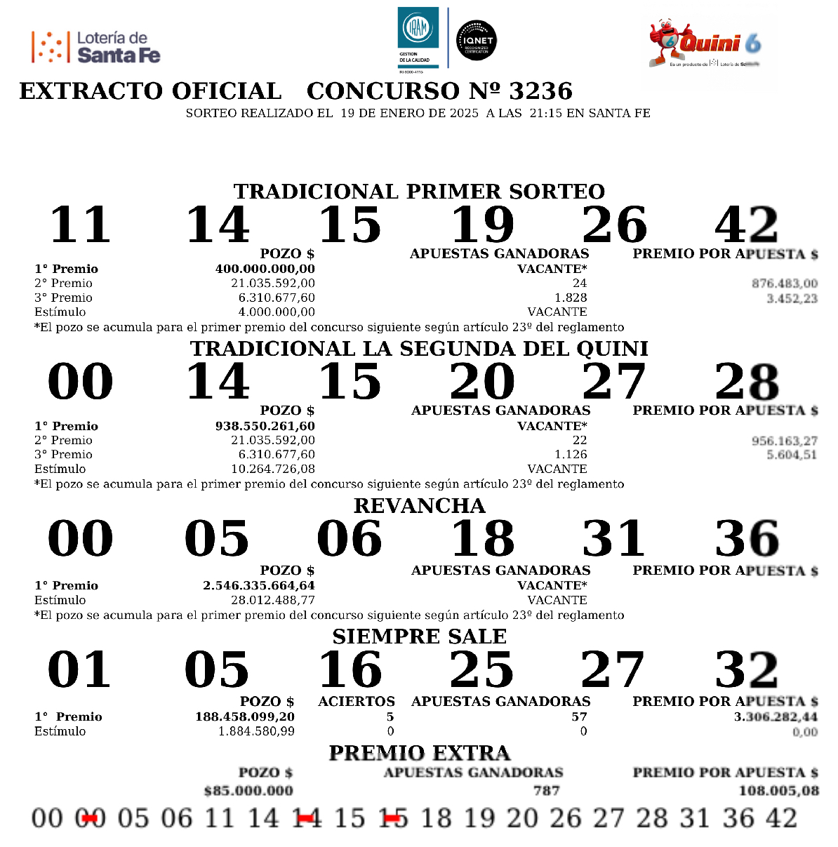 Sociedad | Este domingo no hubo apostadores ganadores en los principales pozos del Quini 6; cincuenta y siete apostadores ganaron más de $3 millones con el Siempre Sale.