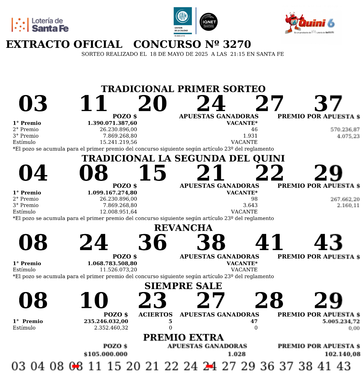 Este domingo 18 de mayo, en el sorteo Tradicional del Quini 6 salieron el 05-16-19-26-27-37, el pozo de $1.390.071.388 quedó vacante.