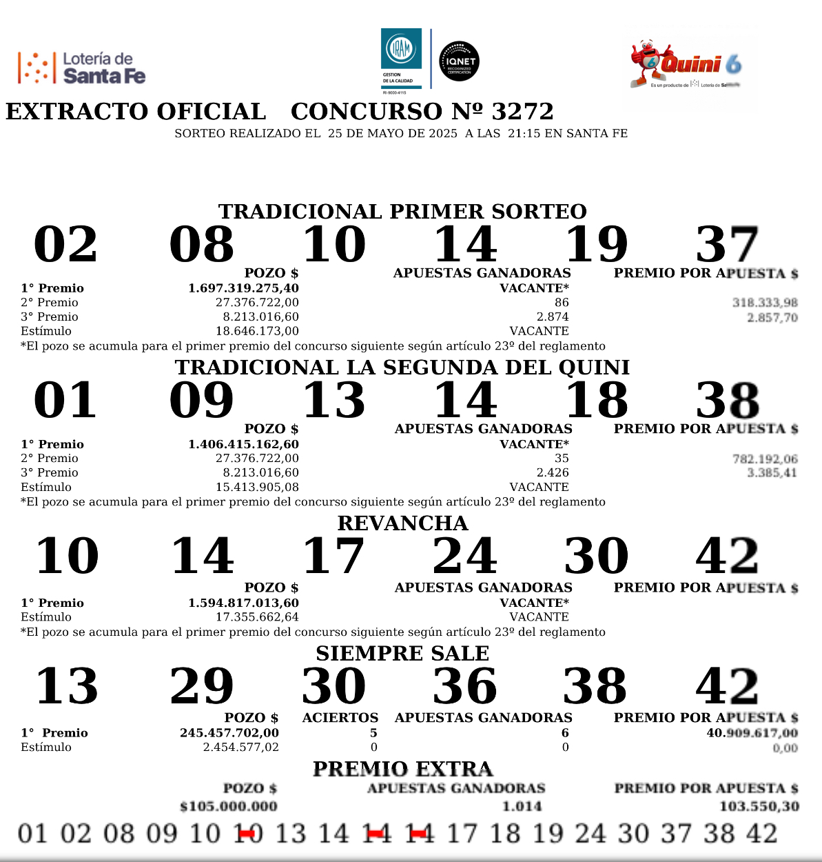 Este domingo, 25 de mayo, en el sorteo Tradicional del Quini 6 salieron el 02-08-10-14-19-37, el pozo de $1.697.319.275 quedó vacante.
