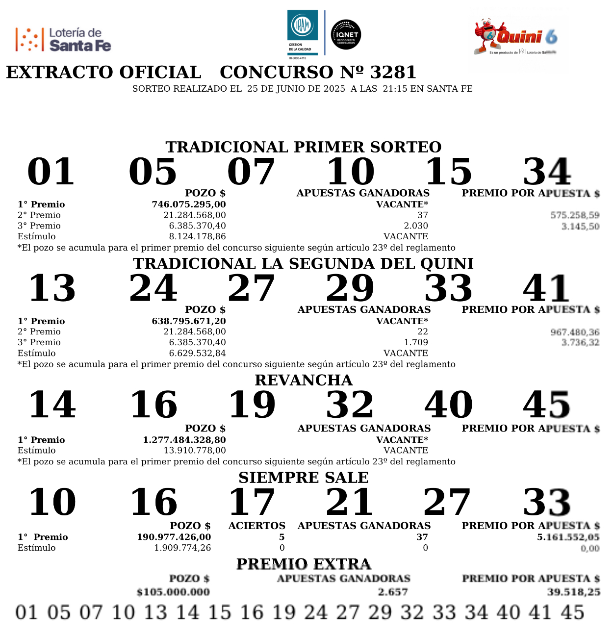 Este miércoles 25 de junio en el sorteo Tradicional del Quini 6 salieron el 01-05-07-10-15-34, el pozo de $746.075.295 quedó vacante.