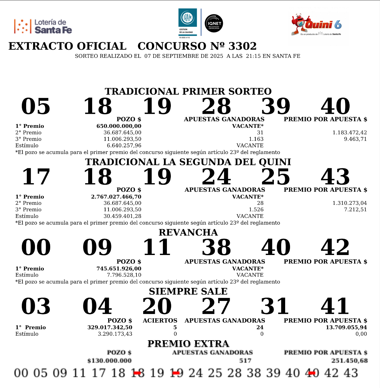 Este domingo se sorteó el concurso N° 3.302 del Quini 6, de la Lotería de Santa Fe.