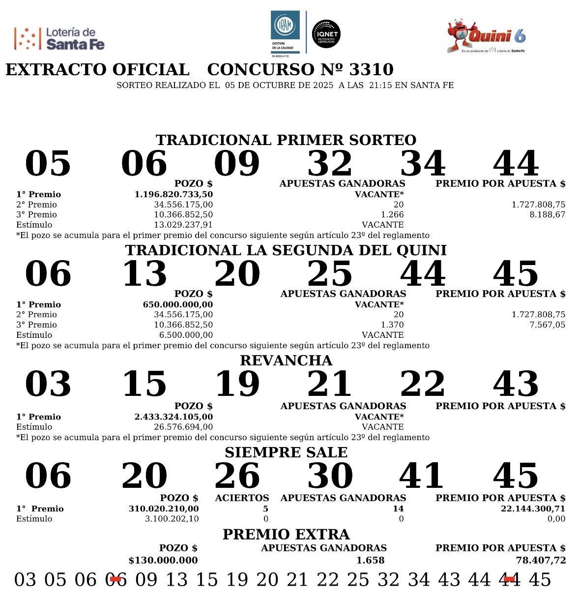 Este domingo 5 de octubre se sorteó el concurso N° 3.310 del Quini 6, de la Lotería de Santa Fe.