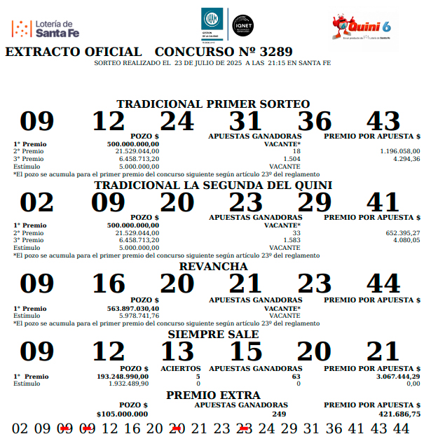 Este miércoles 23 de julio en el sorteo Tradicional del Quini 6 salieron el 09-12-24-31-36-43, el pozo de $500.000.000 quedó vacante.