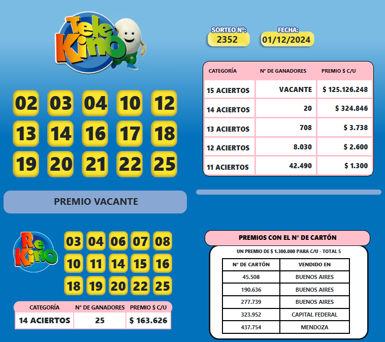 El sorteo 2.352 del Telekino del domingo1 de diciembre para los 15 aciertos el pozo de $125.126.248 vacante.