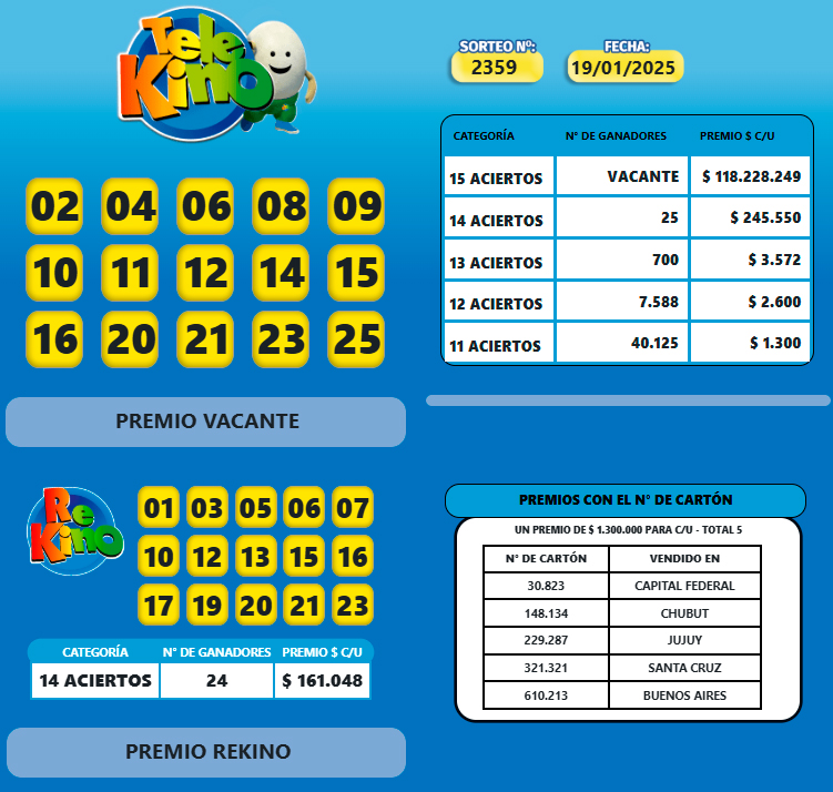 El sorteo 2.359 del Telekino del domingo 19 de enero para los 15 aciertos el pozo de $118.228.249 quedó vacante.