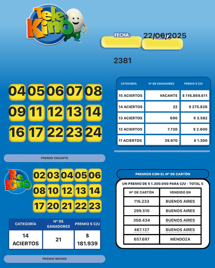 El sorteo 2.381 del Telekino del domingo 22 de junio para los 15 aciertos el pozo de $116.869.611 quedó vacante.