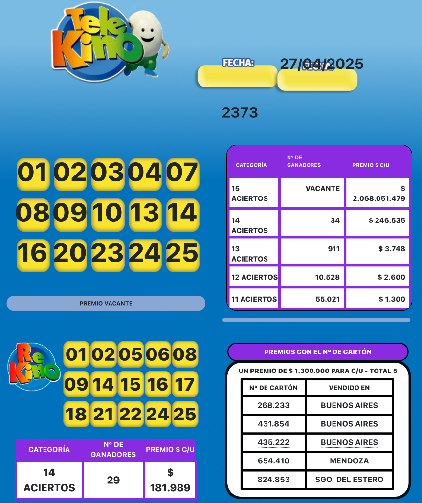 El sorteo 2.373 del Telekino del domingo 27 de abril para los 15 aciertos el pozo de $2.068.051.479 quedó vacante.