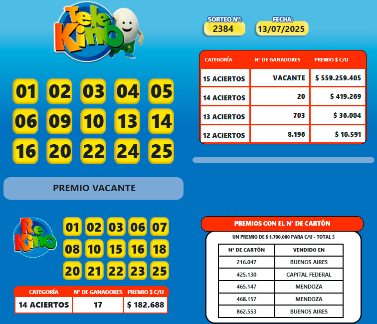 Sociedad | Aquí el resultado del sorteo 2.384 del Telekino que en su versión tradicional el pozo de más de $550 millones quedó vacante, mientras que el pozo del Rekino fue para 17 afortunados.