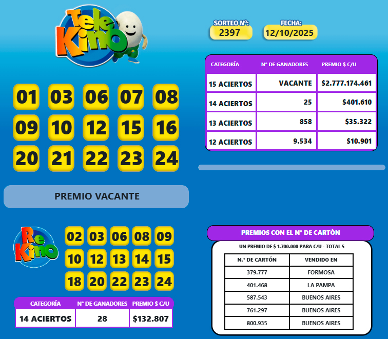 Sociedad | Aquí el resultado del sorteo 2.397 del Telekino que en su versión tradicional el pozo de más de $2.700 millones quedó vacante, mientras que el pozo del Rekino fue para 28 afortunados.