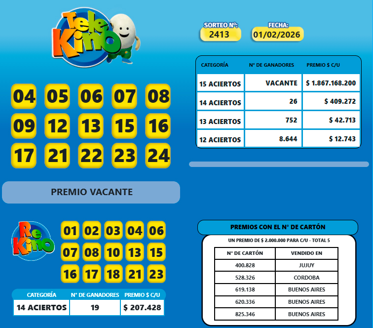 Sociedad | Aquí el resultado del sorteo 2.413 del Telekino que en su versión tradicional con un pozo de más de $1.800 millones quedó vacante, mientras que el pozo del Rekino fue para un 19 apostadores que se lleva más de $200 millones.