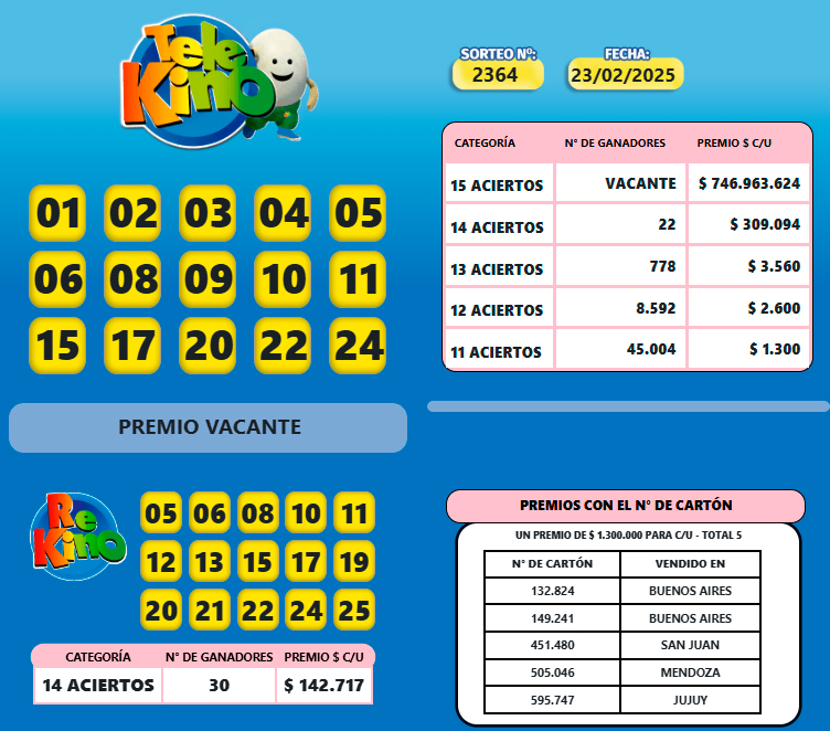 El sorteo 2.364 del Telekino del domingo 23 de febrero para los 15 aciertos el pozo de $746.963.624 quedó vacante.