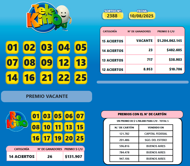 El sorteo 2.388 del Telekino del domingo 10 de agosto para los 15 aciertos el pozo de $1.204.062.145 quedó vacante.