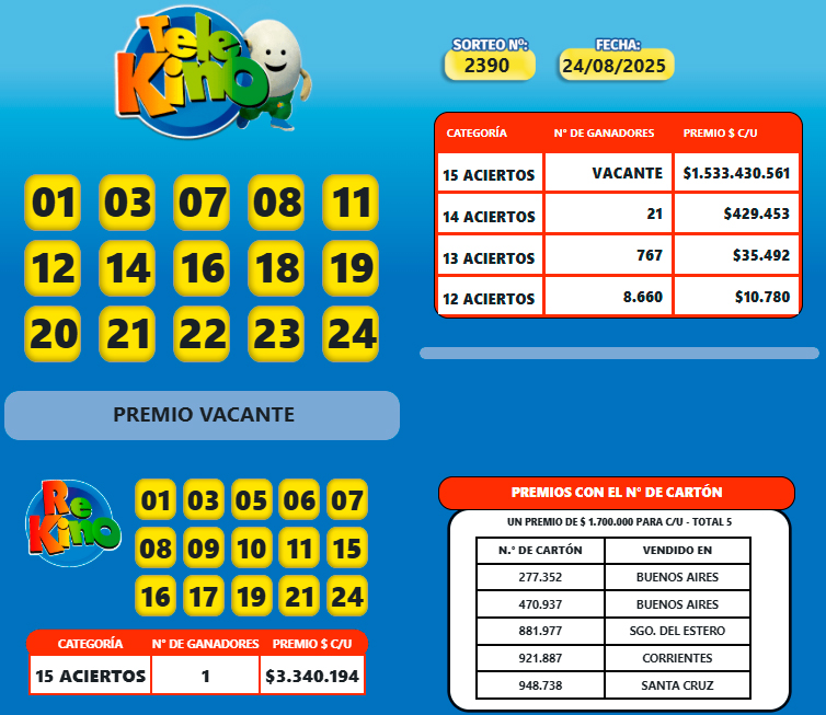 El sorteo 2.390 del Telekino del domingo 24 de agosto para los 15 aciertos el pozo de $1.533.433.561 quedó vacante.