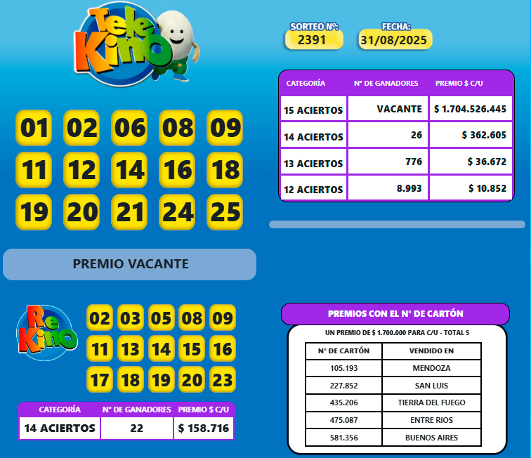 El sorteo 2.391 del Telekino del domingo 31 de agosto para los 15 aciertos el pozo de $1.704.526.445 quedó vacante.