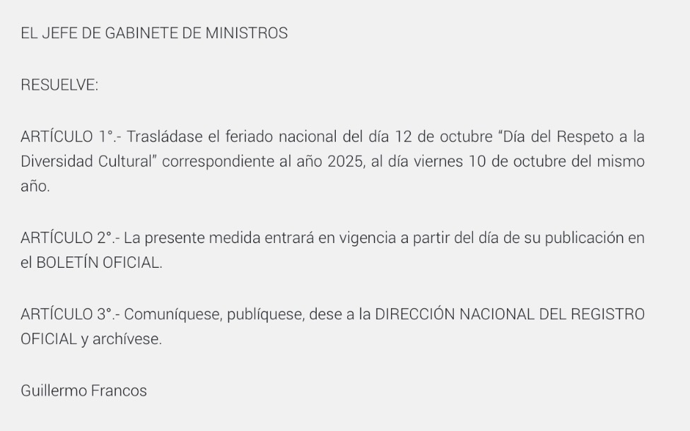Política | El Gobierno trasladó el Día del Respeto a la Diversidad Cultural del domingo 12 al viernes 10 de octubre, creando un feriado puente que apunta a dinamizar el turismo, el consumo y la gastronomía en todo el país.