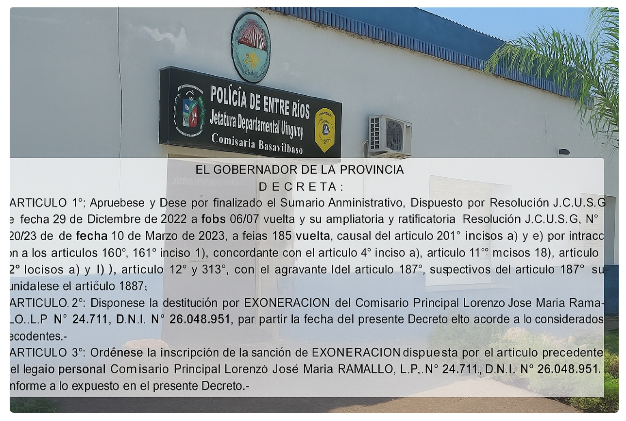 El Gobierno de Entre Ríos resolvió aprobar y dar por concluido el Sumario Administrativo iniciado contra el Comisario Principal Lorenzo José María Ramallo (L.P. 24.711, DNI 26.048.951) y, como consecuencia, destituirlo por exoneración, ordenando además que la sanción se inscriba en su legajo personal.