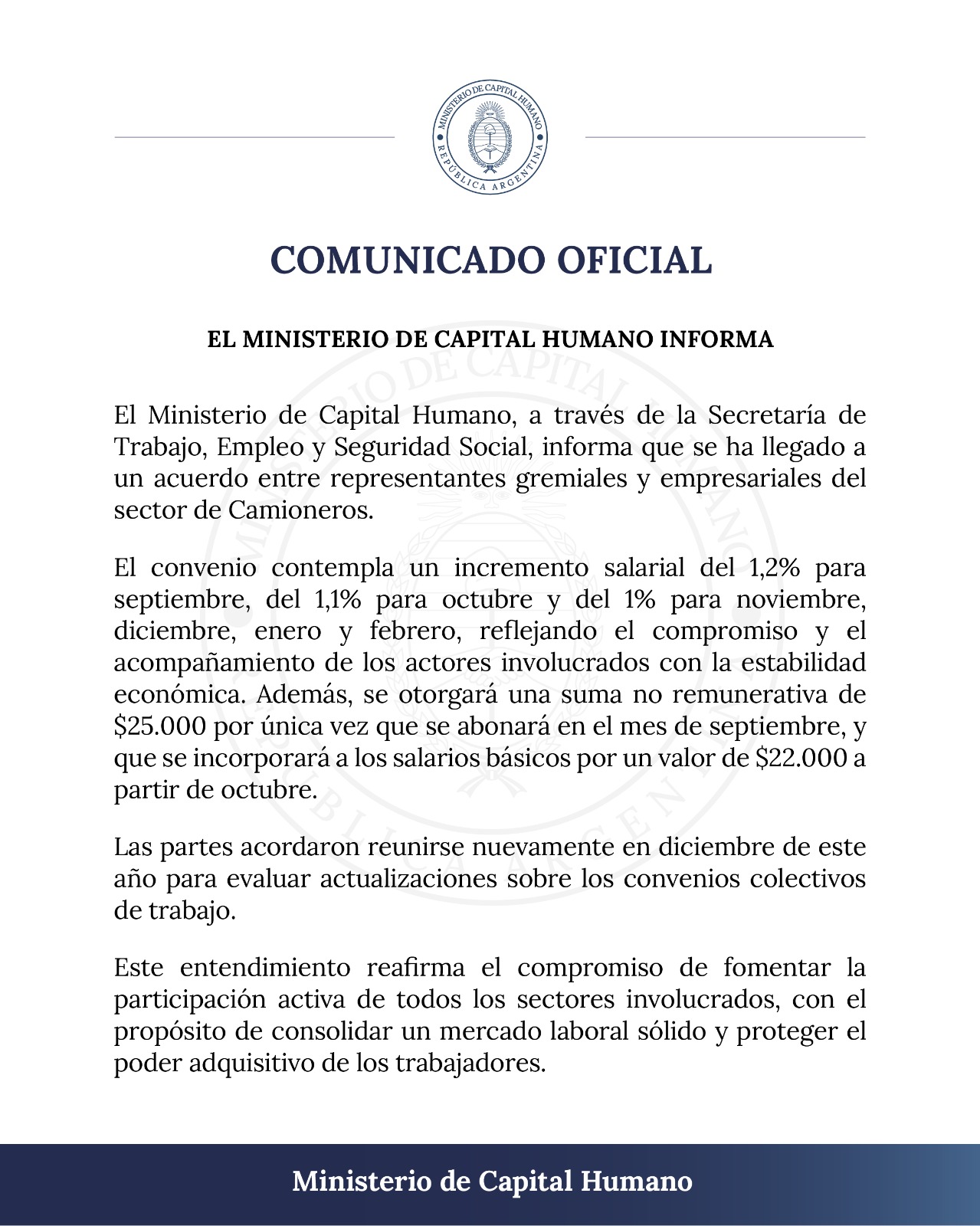 “Este acuerdo reafirma el compromiso de todos los sectores con la estabilidad económica y la defensa del poder adquisitivo de los trabajadores”, señaló el comunicado oficial de Capital Humano, del que depende la Secretaría de Trabajo.