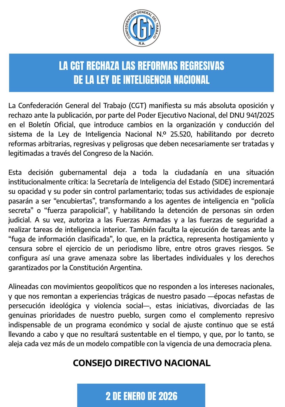 La Confederación General del Trabajo (CGT) endureció su postura frente al Gobierno nacional al manifestar su “más absoluta oposición y rechazo” al Decreto de Necesidad y Urgencia (DNU) que modifica la Ley de Inteligencia Nacional.