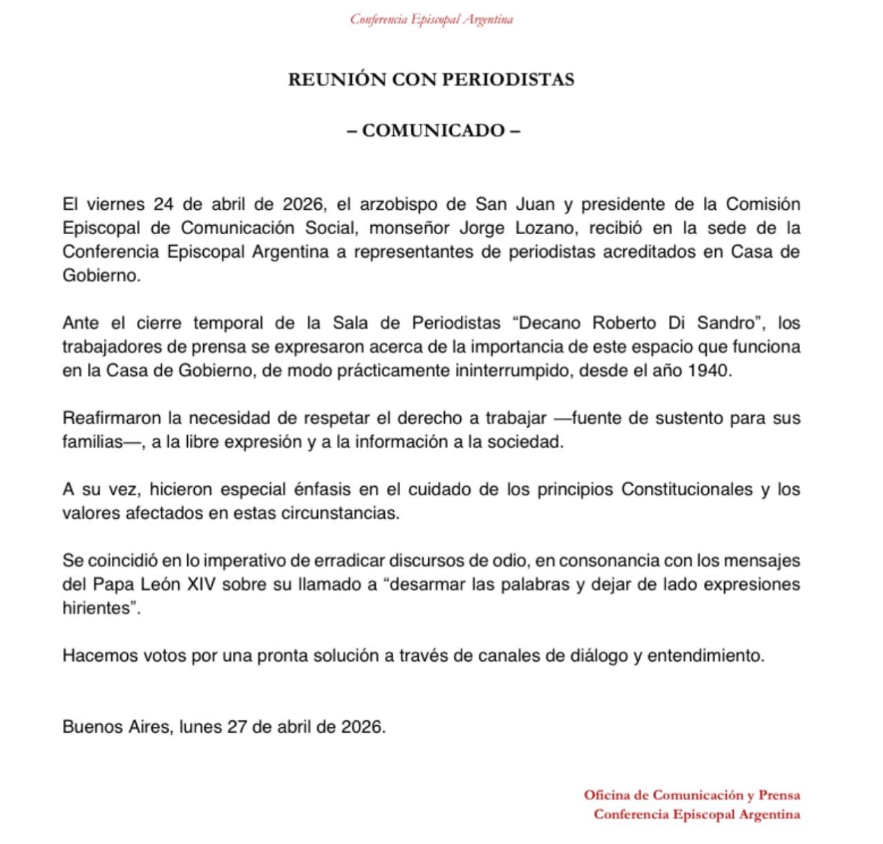 El respaldo institucional llegó desde la Conferencia Episcopal Argentina, que pidió públicamente una pronta solución al diferendo y reclamó que se restituya el ingreso a los corresponsales afectados, en un hecho que encendió preocupación en el ámbito periodístico por tratarse de una situación sin precedentes en más de ocho décadas de funcionamiento de la Sala de Periodistas “Decano Roberto Di Sandro”.