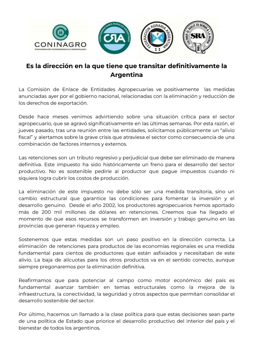“Desde hace meses venimos advirtiendo sobre una situación crítica para el sector agropecuario, que se agravó significativamente en las últimas semanas. Por esta razón, el jueves pasado, tras una reunión entre las entidades, solicitamos públicamente un "alivio fiscal" y alertamos sobre la grave crisis que atraviesa el sector como consecuencia de una combinación de factores internos y externos”, declararon las cuatro principales entidades del agro -la Sociedad Rural Argentina, Federación Agraria Argentina, Confederaciones Rurales Argentinas y Coninagro- en un comunicado conjunto.