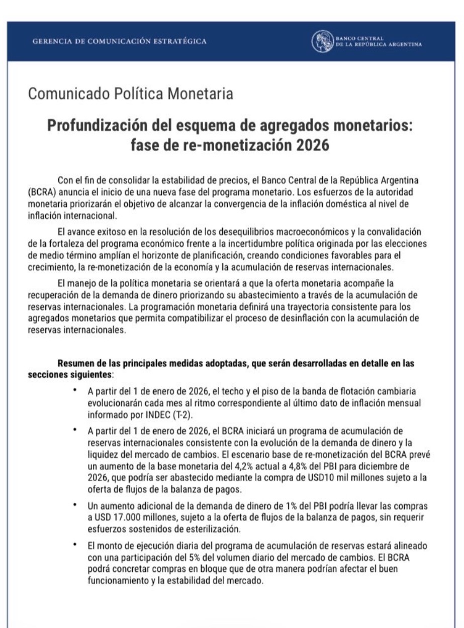"A partir del 1 de enero de 2026, el techo y el piso de la banda de flotación cambiaria evolucionarán cada mes al ritmo correspondiente al último dato de inflación mensual informado por INDEC", mencionaron.
