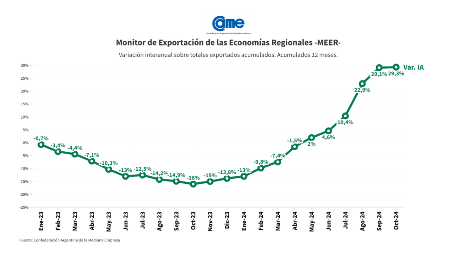 Economía | De acuerdo con el Monitor de Exportaciones de las Economías Regionales (MEER) elaborado por CAME, el mes de octubre terminó con un incremento en las exportaciones de las economías regionales del 29,3% en dólares y 23,4% en toneladas, lo que representa una suba interanual de USD 1.990,3 millones en el total exportado y de 1,3 millones de toneladas en el volumen comercializado.