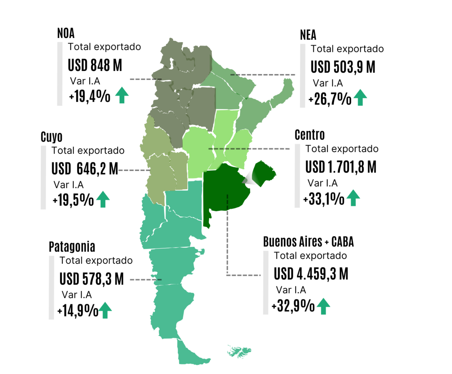 Buenos Aires + CABA: es la principal región exportadora del país, representando un 50,8% del total exportado en dólares por las economías regionales.