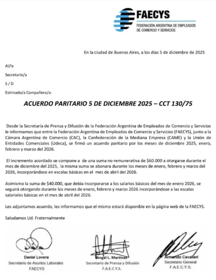La Federación Argentina de Empleados de Comercio y Servicios (FAECyS) anunció la firma de un acuerdo con las principales cadenas de supermercados del país para otorgar un bono extraordinario de fin de año de $170.000 a sus trabajadoras y trabajadores.