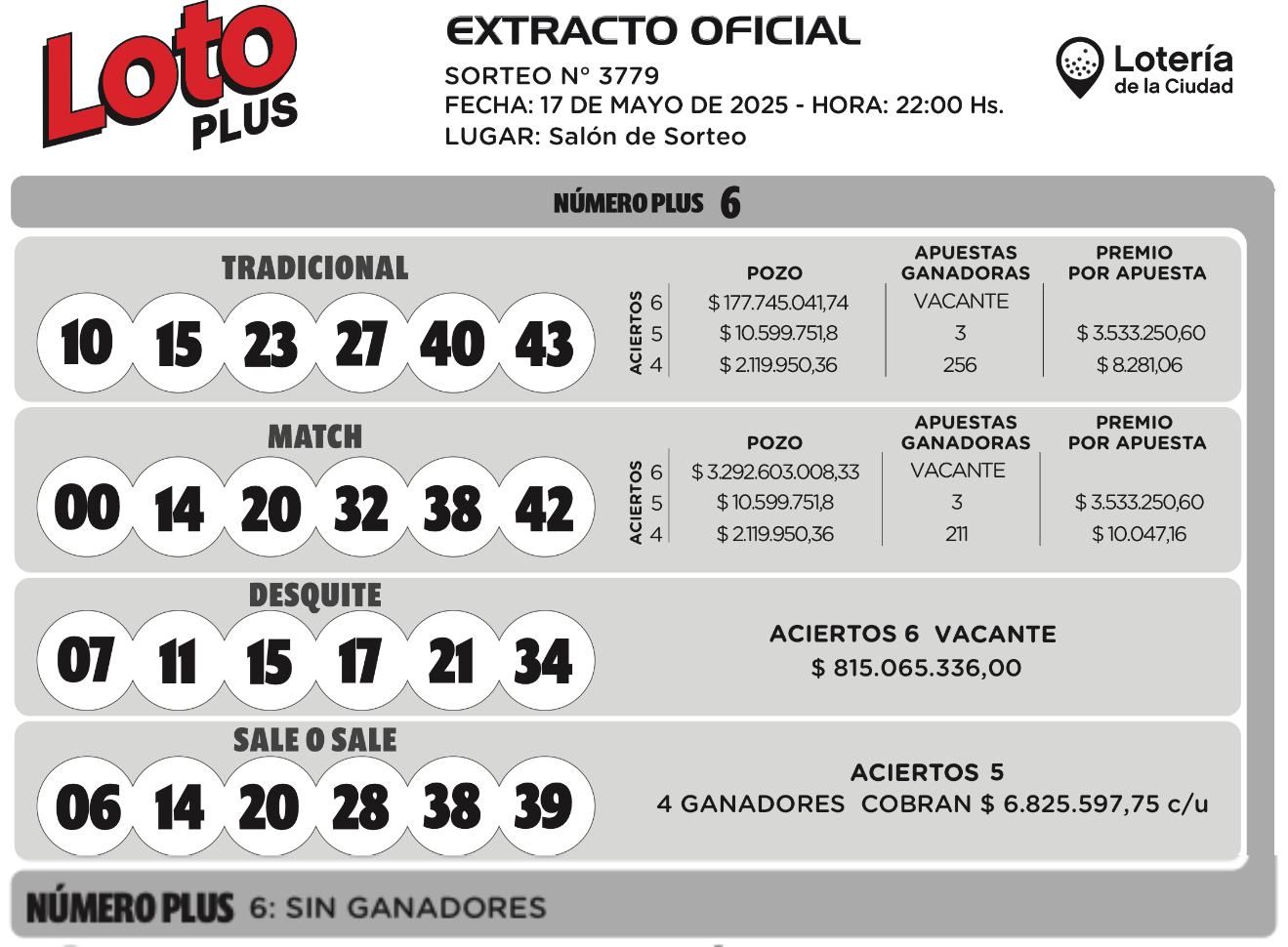 El sorteo del Loto Plus 3.779 realizado el sábado 17 de mayo en la versión Tradicional con un pozo de $177.745.041 quedó vacante.