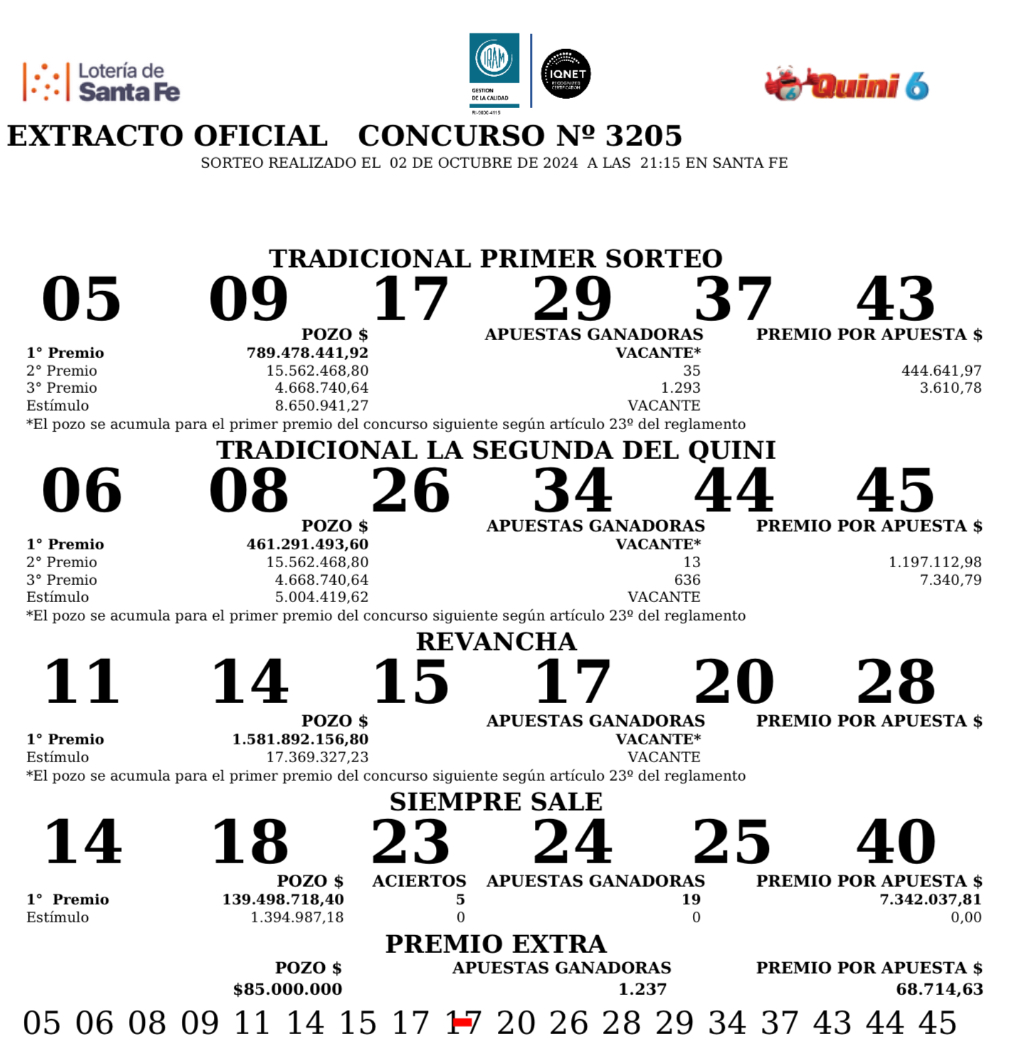 Sociedad | No hubo ganadores con todos los aciertos en las modalidades Tradicional, Segunda y el Revancha del Quini 6, sorteo 3.205, los pozos quedaron vacantes mientras diecinueve fueron los ganadores con el Siempre Sale de más de $7 millones cada uno.