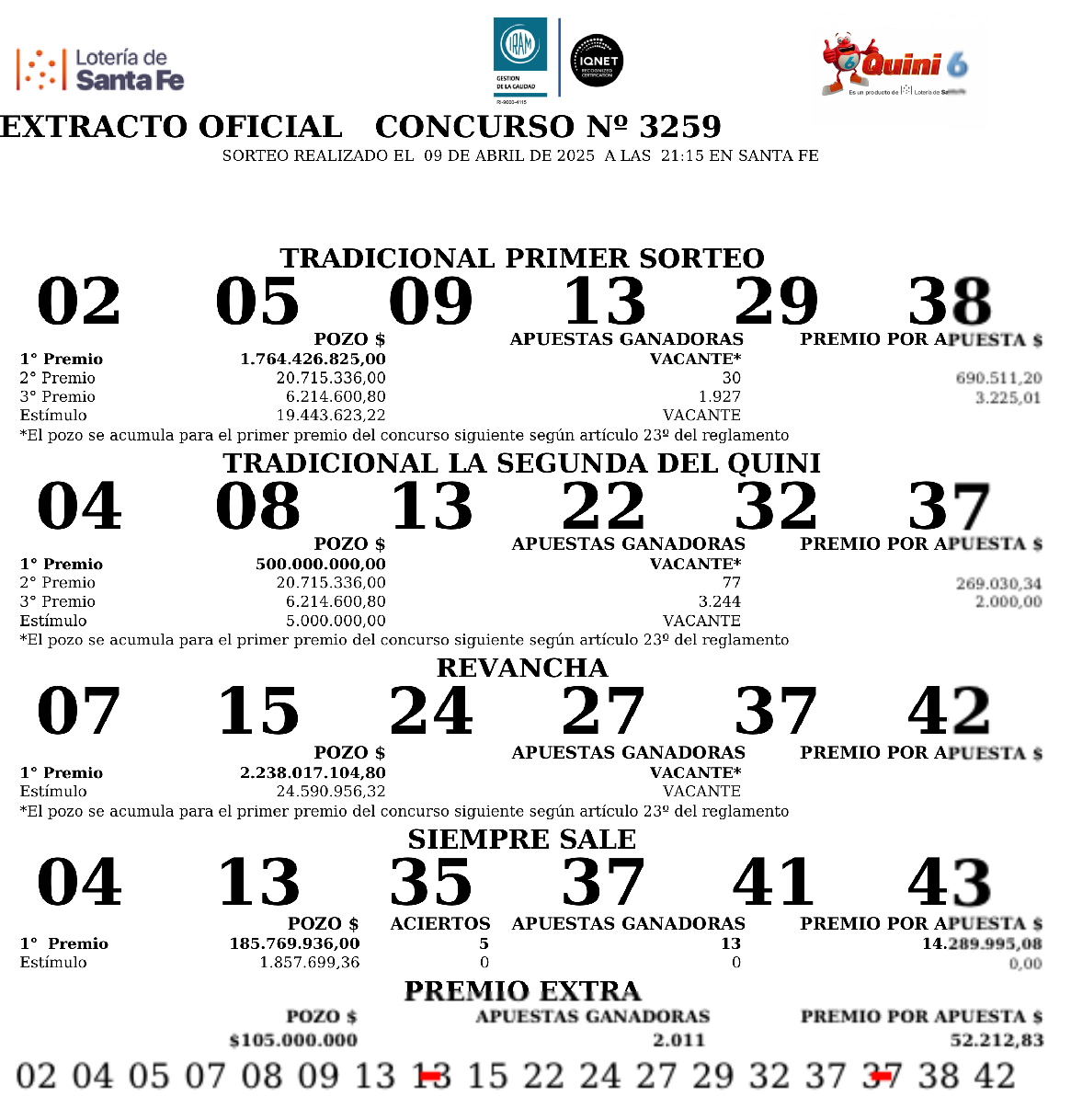 Este miércoles, 9 de abril, en el sorteo Tradicional del Quini 6 salieron el 02-05-09-13-29-38, el pozo de $1.764.426.825 quedó vacante.