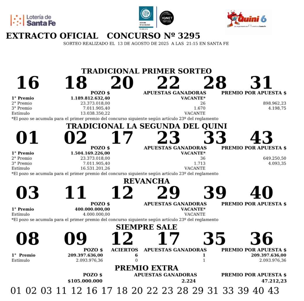 Este miércoles 13 de agosto en el sorteo Tradicional del Quini 6 salieron el 16-18-20-22-28-31, el pozo de $1.189.812.632 quedó vacante.