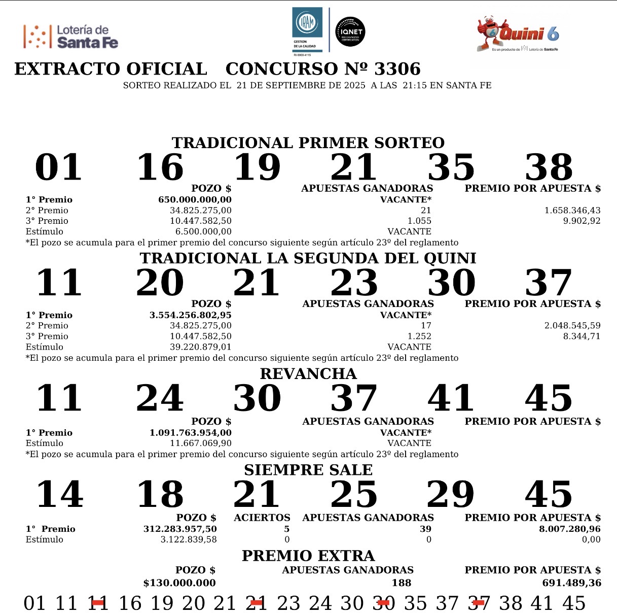 Este domingo se sorteó el concurso N° 3.305 del Quini 6, de la Lotería de Santa Fe.