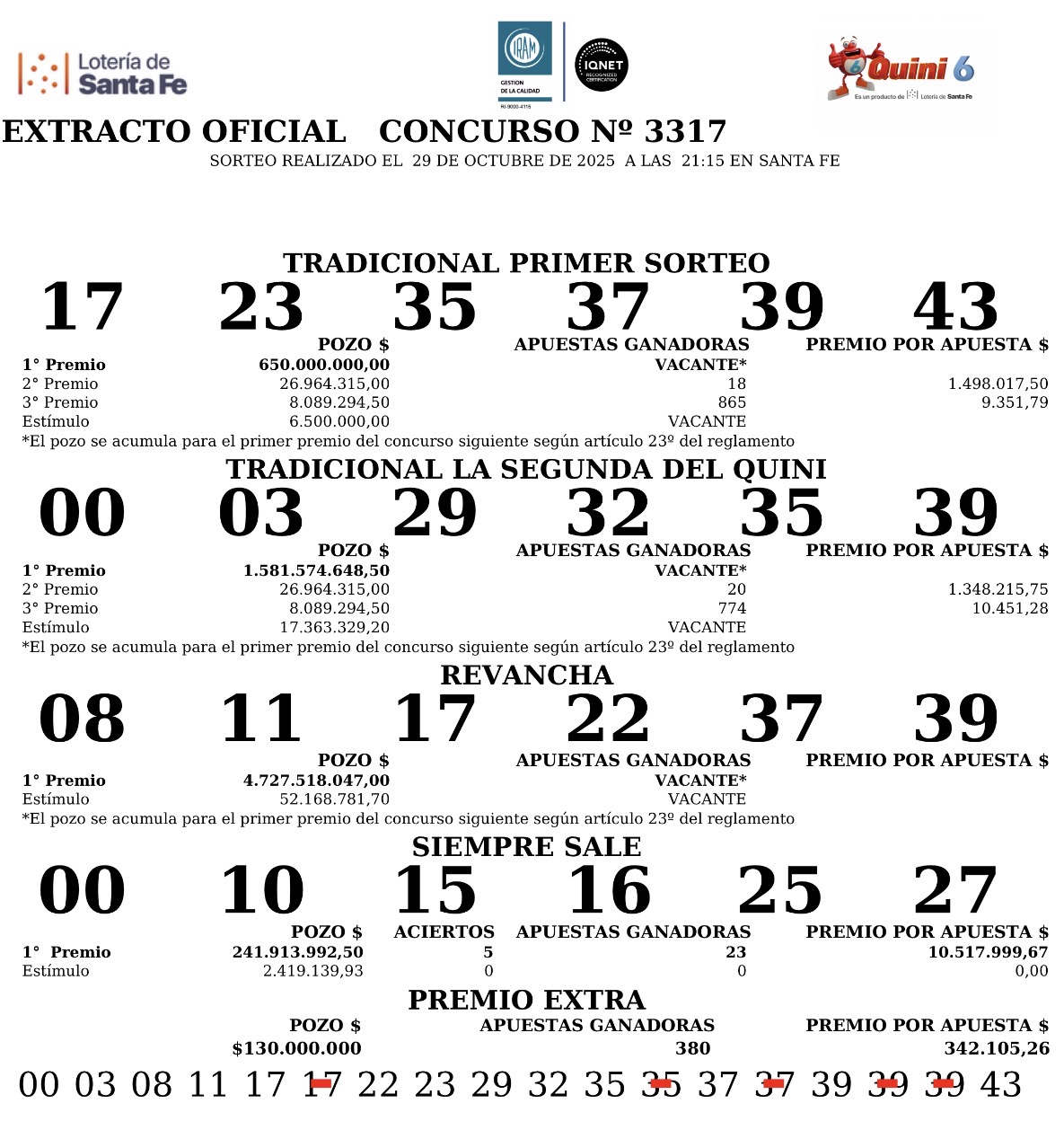 Este miércoles 29 de octubre se sorteó el concurso N° 3.317 del Quini 6, de la Lotería de Santa Fe.