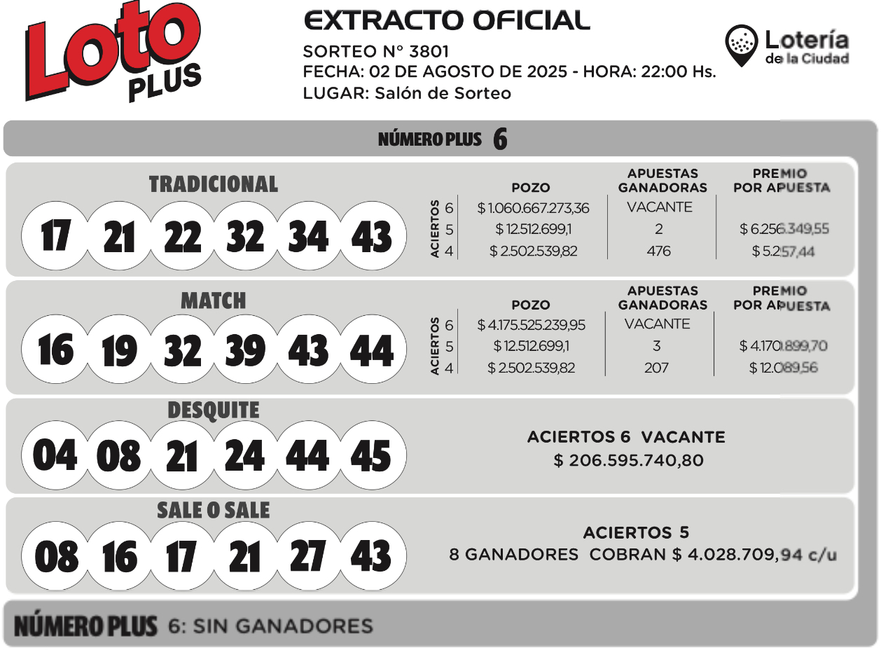 En el Sale o Sale hubo 8 ganadores, con cinco aciertos de estos números 08-16-17-21-27-43, cobrarán cada uno $4.028.709.