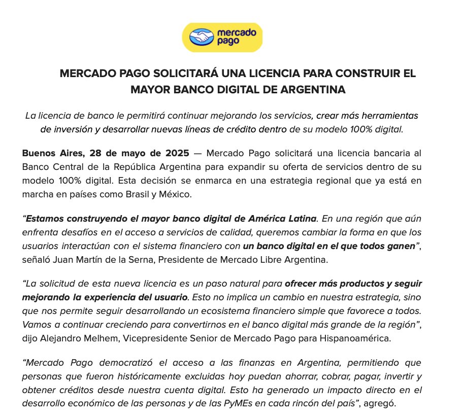 A su vez, detalló que es un banco digital en el que "todos van a ganar". Por su parte, el vicepresidente Senior de Mercado Pago para Hispanoamérica, Alejandro Melhem, celebró la iniciativa y sostuvo que la solicitud de la licencia "es un paso natural" para "ofrecer más productos y seguir mejorando la experiencia del usuario".