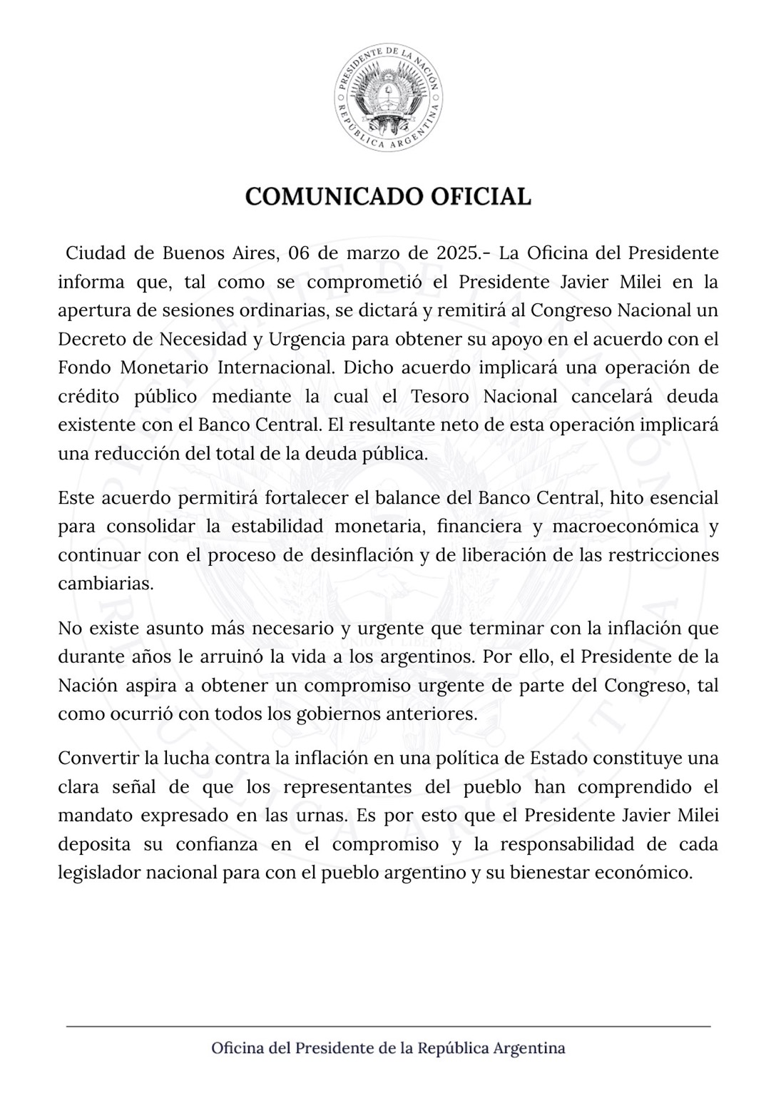 El gobierno de Javier Milei confirmó a través de un comunicado oficial que enviará al Congreso Nacional un Decreto de Necesidad y Urgencia (DNU) para obtener apoyo en el acuerdo con el Fondo Monetario Internacional (FMI).