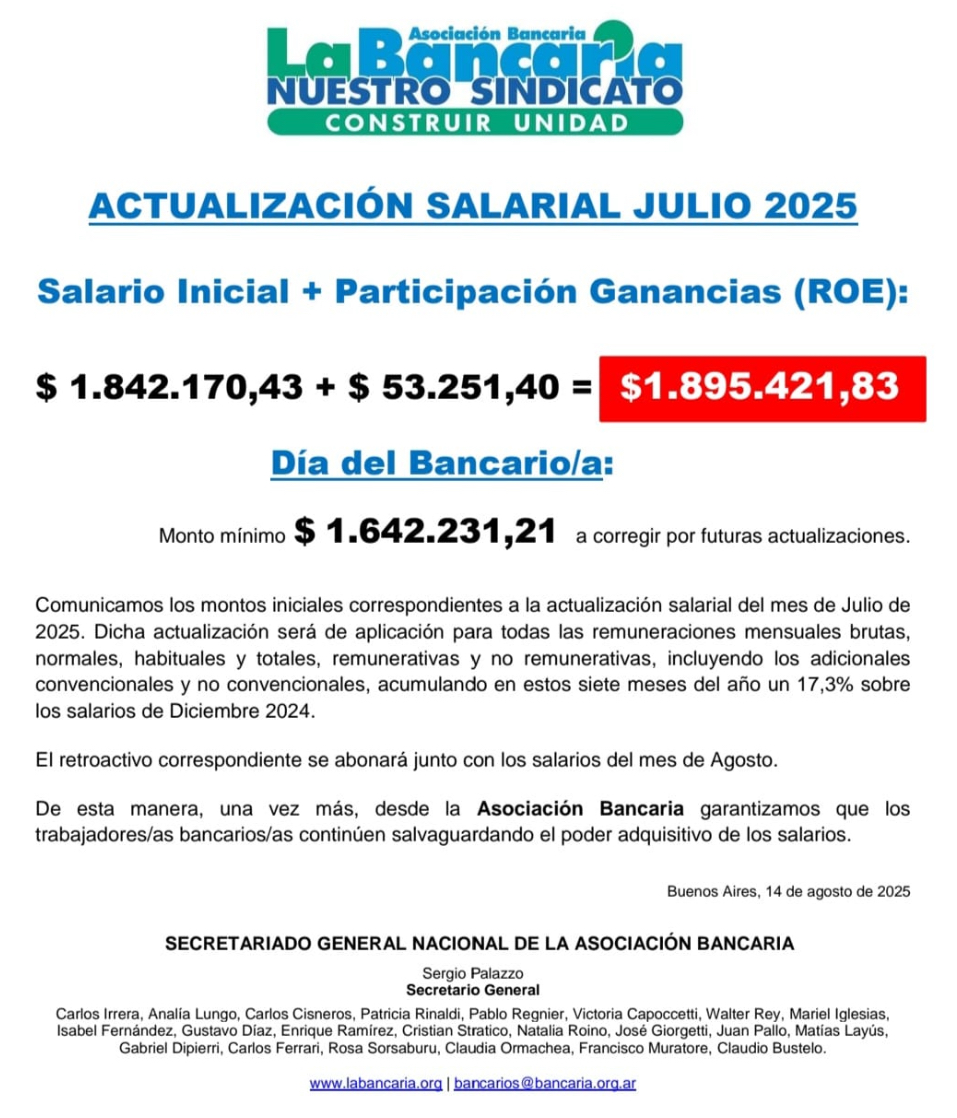 "Comunicamos los montos iniciales correspondientes a la actualización salarial del mes de Julio de 2025. Dicha actualización será de aplicación para todas las remuneraciones mensuales brutas, normales, habituales y totales, remunerativas y no remunerativas, incluyendo los adicionales convencionales y no convencionales, acumulando en estos siete meses del año un 17,3% sobre los salarios de Diciembre 2024", informó el gremio.