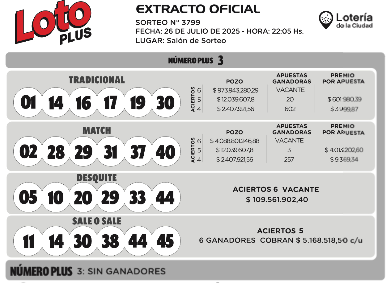 En el Sale o Sale hubo 6 ganadores, con cinco aciertos de estos números 11-14-30-38-44-45, cobrarán cada uno $5.168.518.