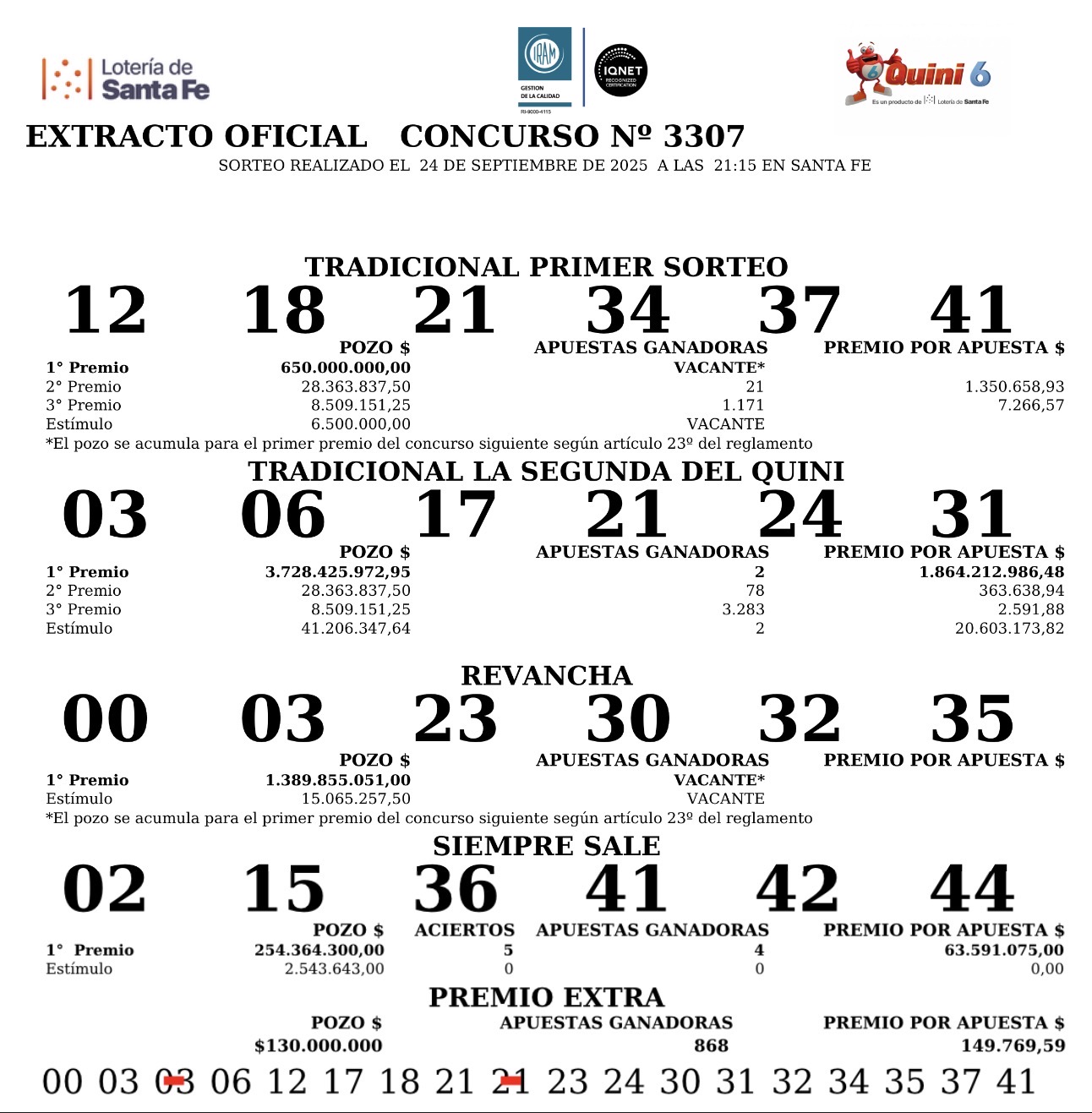 Este miércoles se sorteó el concurso N° 3.306 del Quini 6, de la Lotería de Santa Fe.
