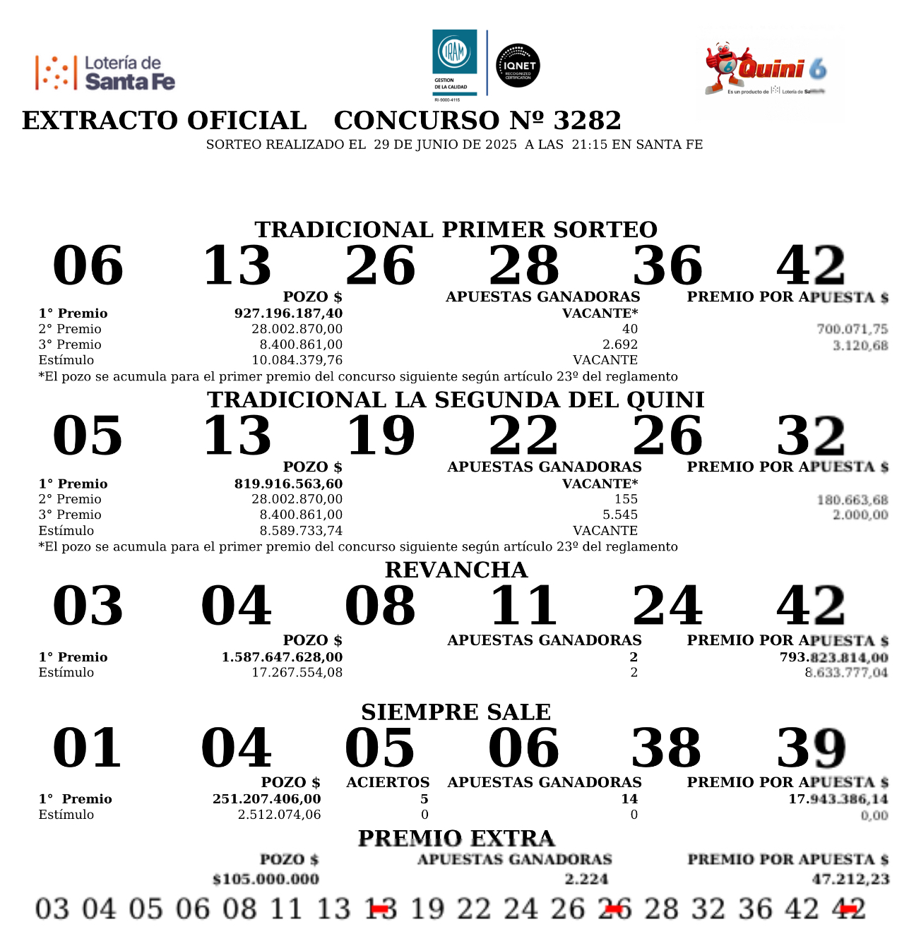 Este domingo 29 de junio en el sorteo Tradicional del Quini 6 salieron el 06-13-26-28-36-42, el pozo de $927.196.187 quedó vacante.