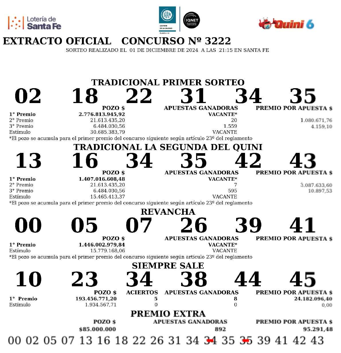 En el sorteo Tradicional del Quini 6 salieron el el 02-18-22-31-34-35. Ningún apostador acertó todos los números y el pozo de $2.776.813.946 quedó vacante.
