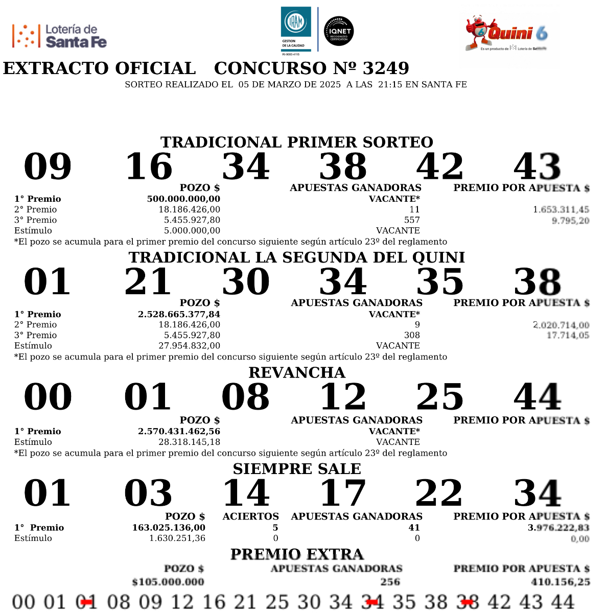Este miércoles en el sorteo Tradicional del Quini 6 salieron el 09-16-34-38-42-43, el pozo de $500.000.000 quedó vacante.