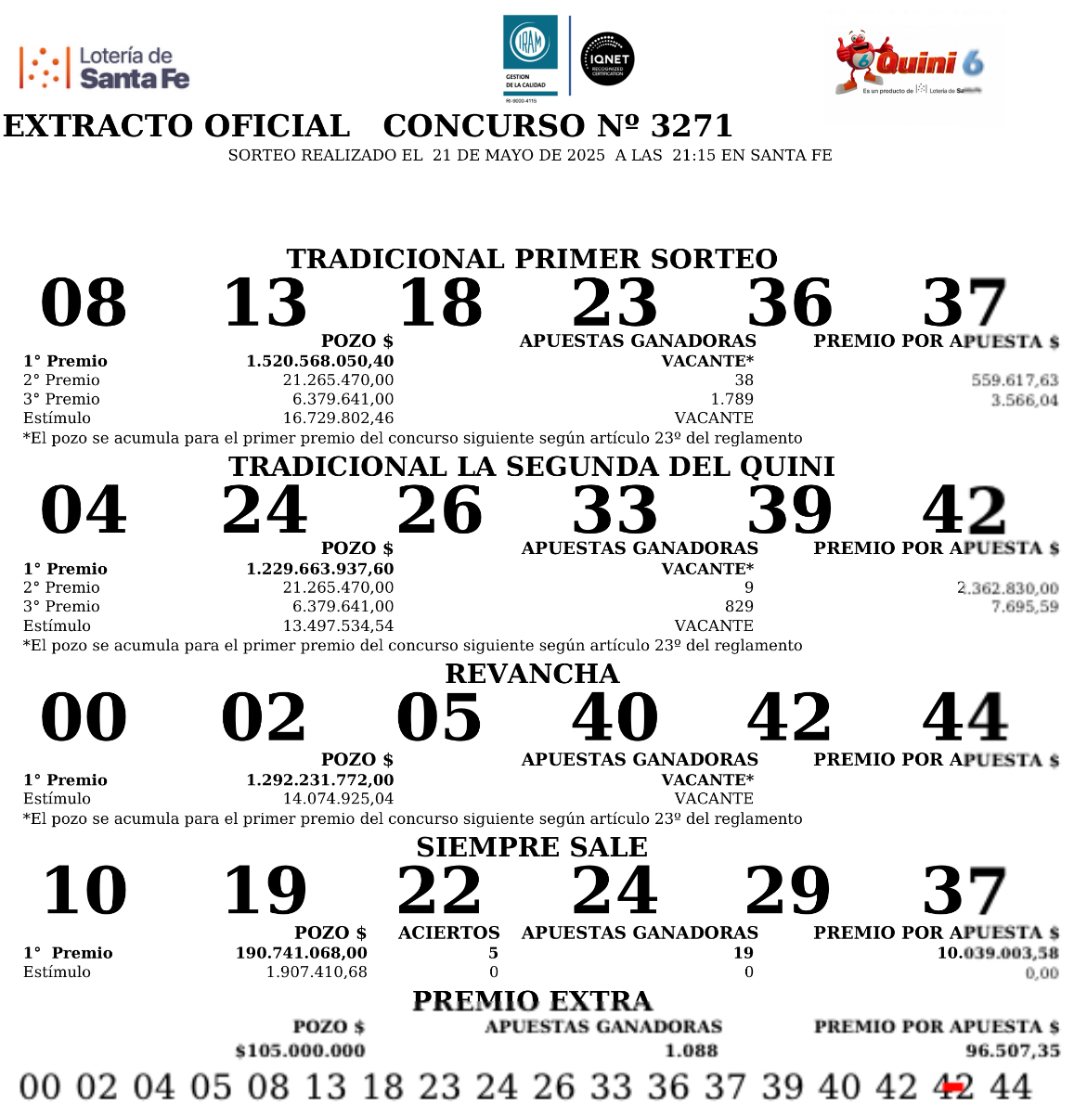 Este miércoles 21 de mayo, en el sorteo Tradicional del Quini 6 salieron el 08-13-18-23-36-37, el pozo de $1.520.568.050 quedó vacante.