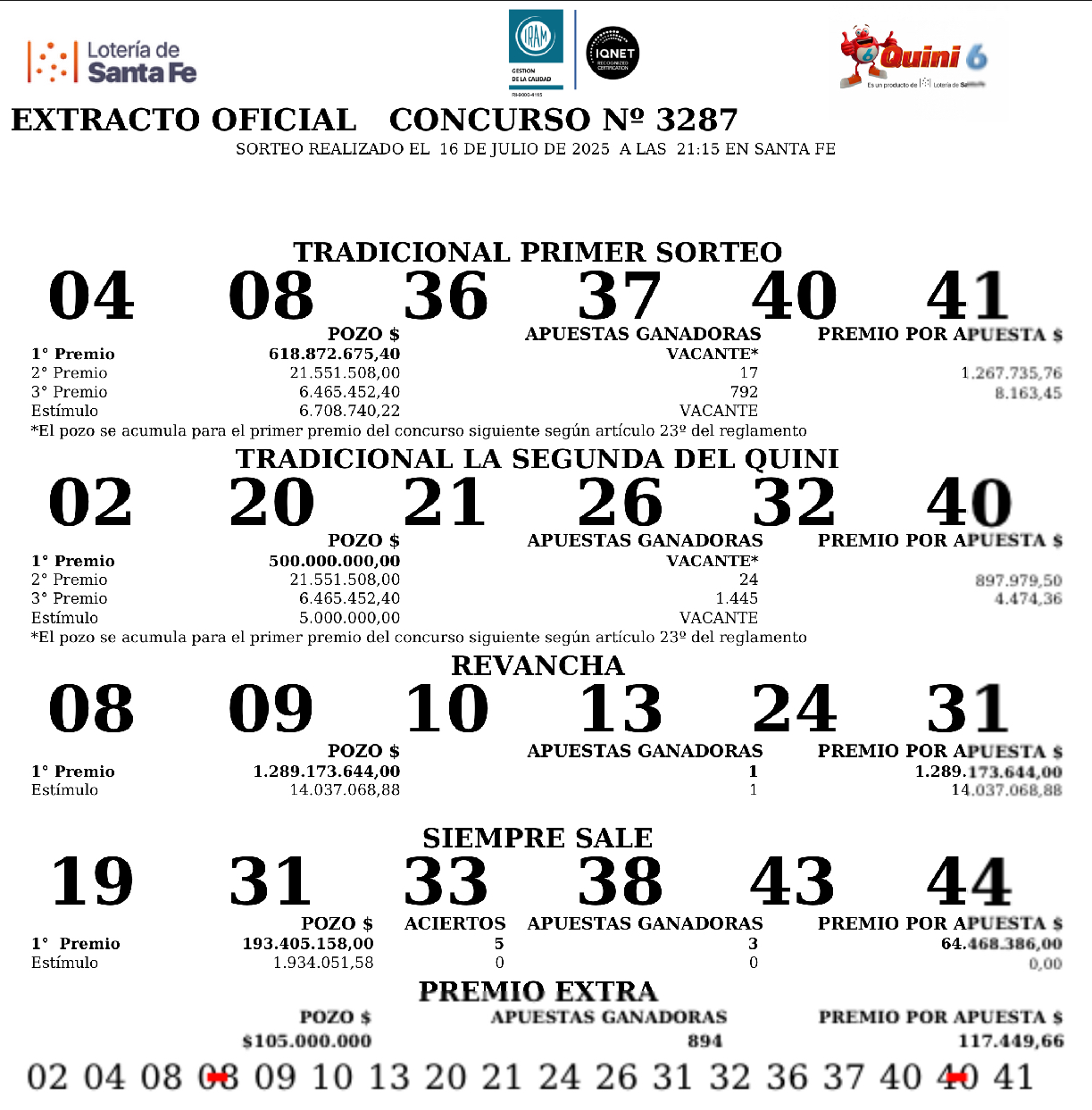 Este miércoles 16 de julio en el sorteo Tradicional del Quini 6 salieron el 04-08-36-37-40-41, el pozo de $618.872.675 quedó vacante.