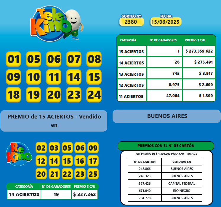 El sorteo 2.380 del Telekino del domingo 15 de junio para los 15 aciertos el pozo de $273.359.622 quedó en manos de un apostador Buenos Aires.