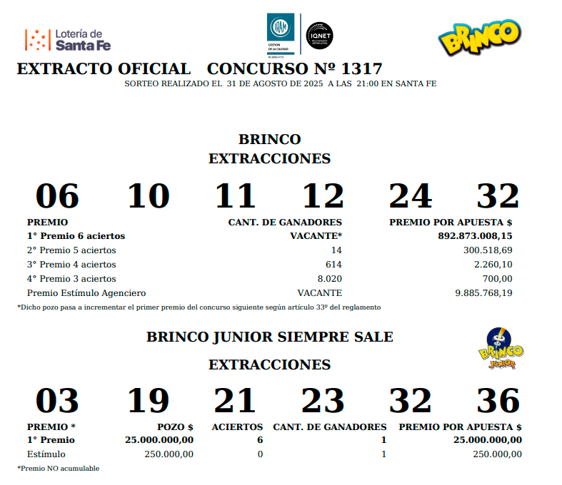 En el Brinco, concurso 1.317 sorteo del domingo 31 de agosto con seis aciertos $892.873.008 quedó vacante.